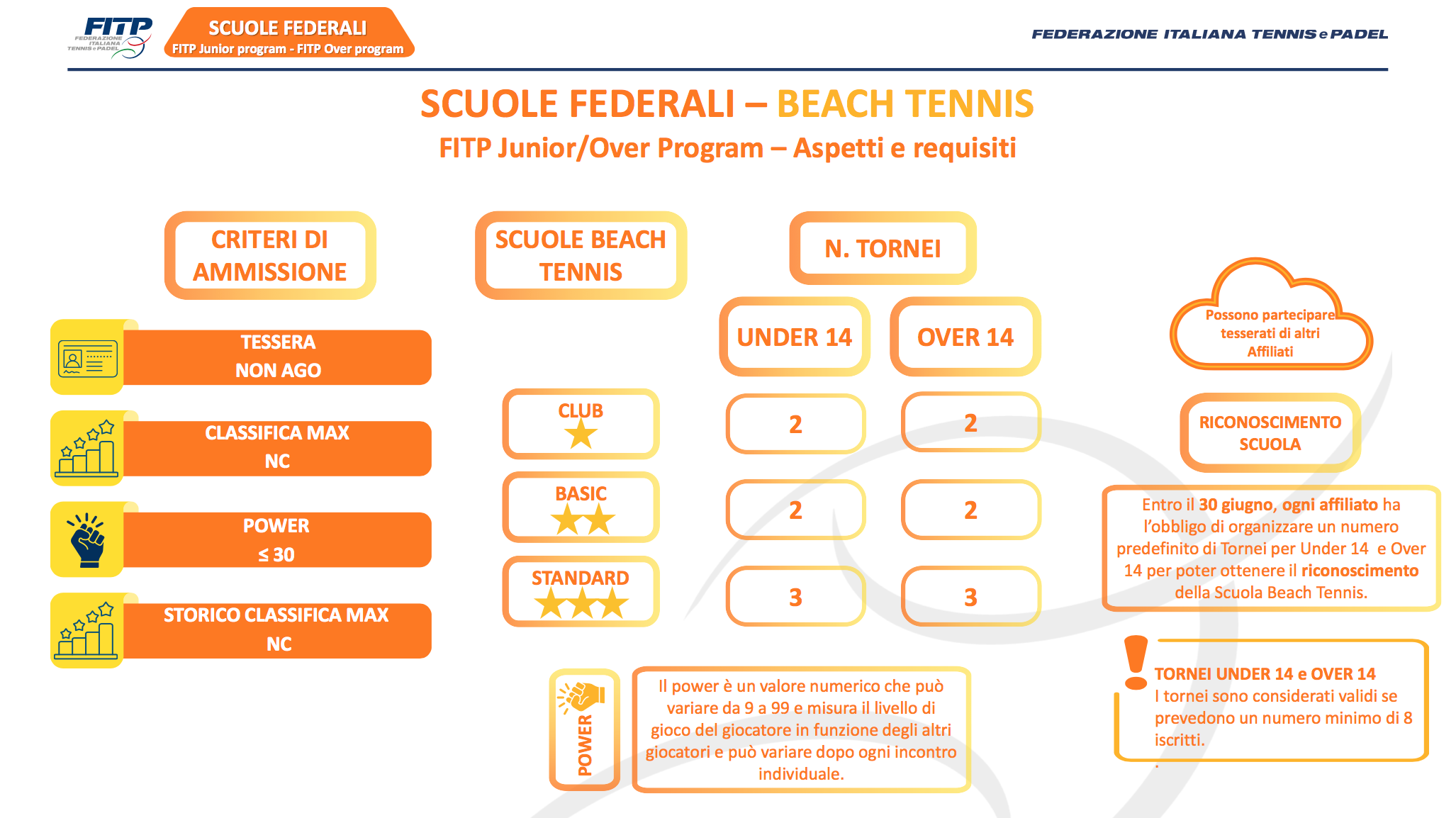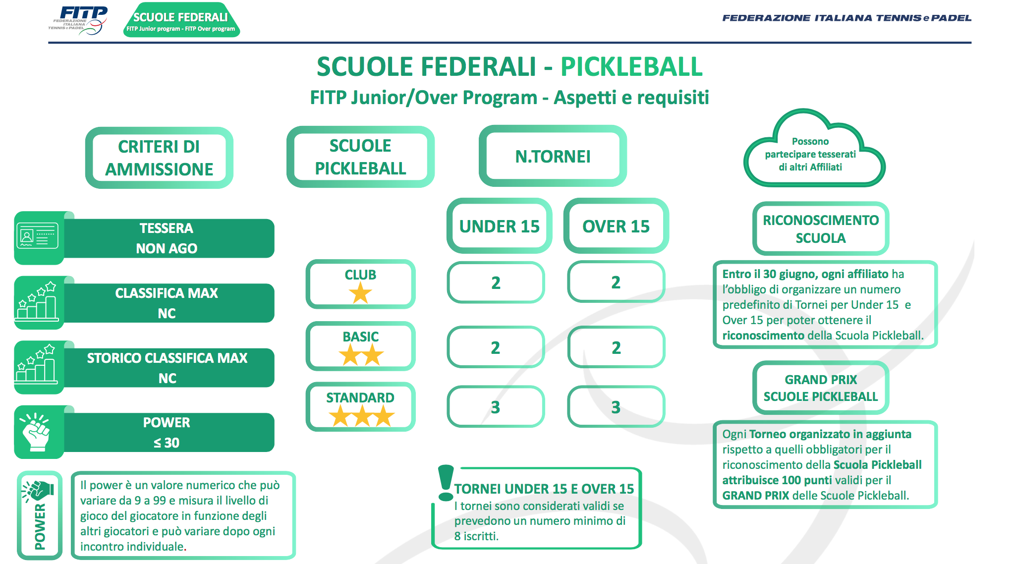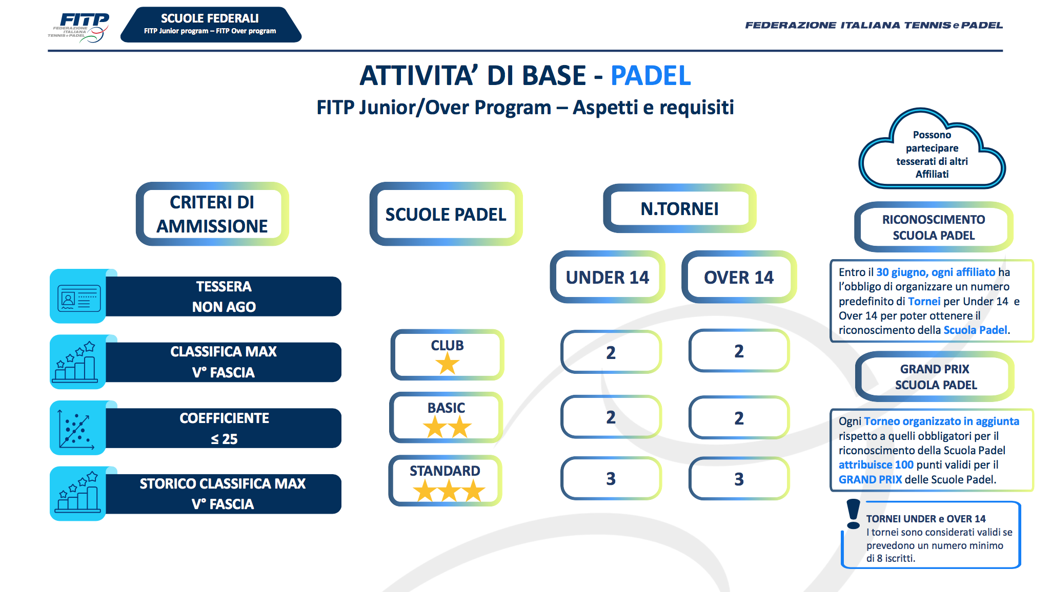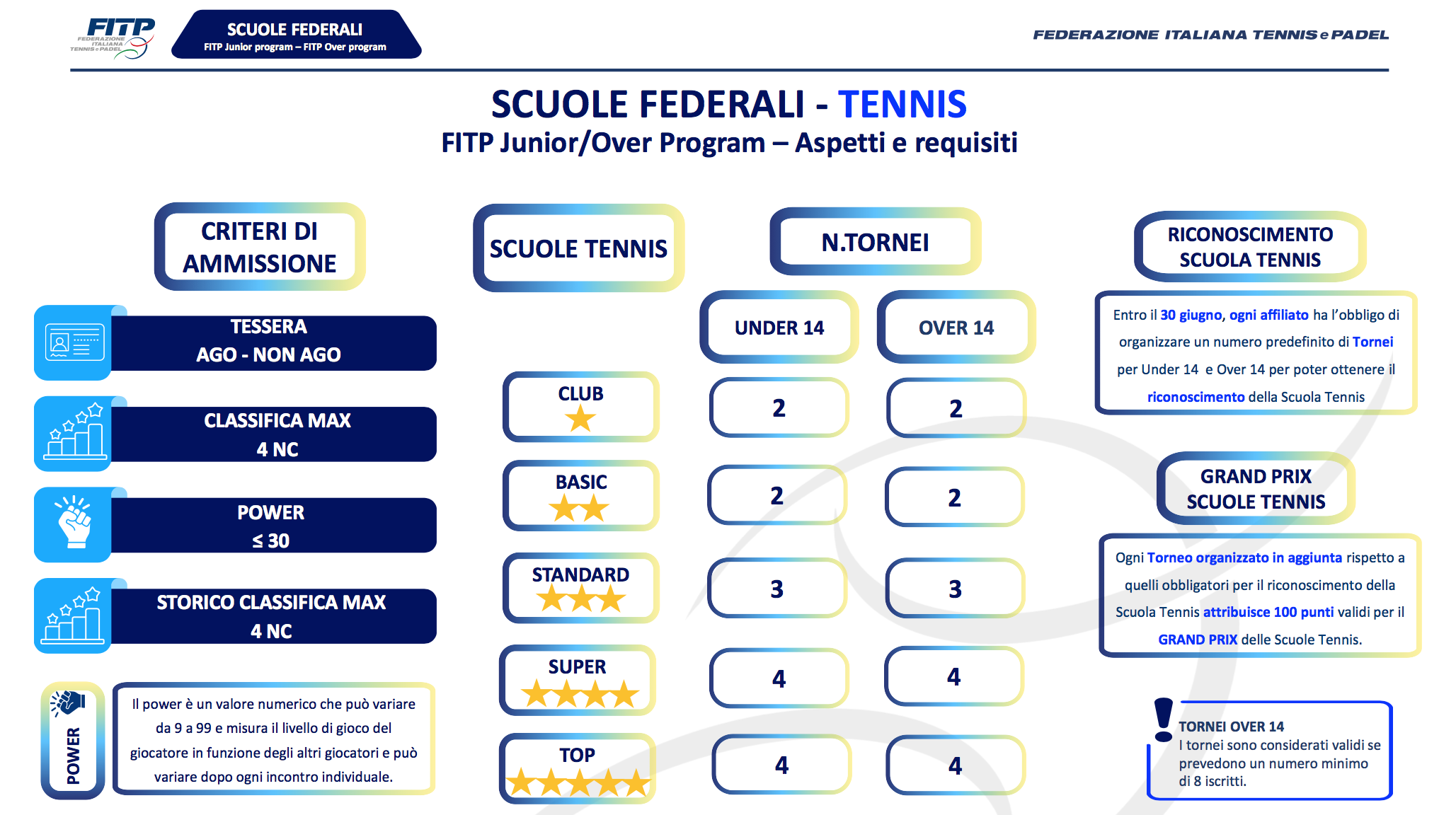 La peculiarità è che questi tornei si svolgono all'interno dei club dove si è cominciato a giocare per la prima volta. A seconda del livello di gioco, sono divisi in tre categorie – bronze, silver e gold – e sono organizzati sul modello di un Open day, con girone all'italiana per giocare molte partite e momenti di confronto formativo e di socializzazione. L'organizzazione di questi appuntamenti diventa inoltre essenziale per ottenere un riconoscimento di scuola FITP, poiché uno dei parametri di riferimento per salire in classifica nel Grand Prix delle scuole federali è proprio il numero di tornei che si mandano in scena. Per il riconoscimento federale, la scuola club, così come la basic, dovrà organizzarne due, la standard tre, super e top nel tennis dovranno arrivare a quattro tornei disputati entro il 30 giugno 2026.