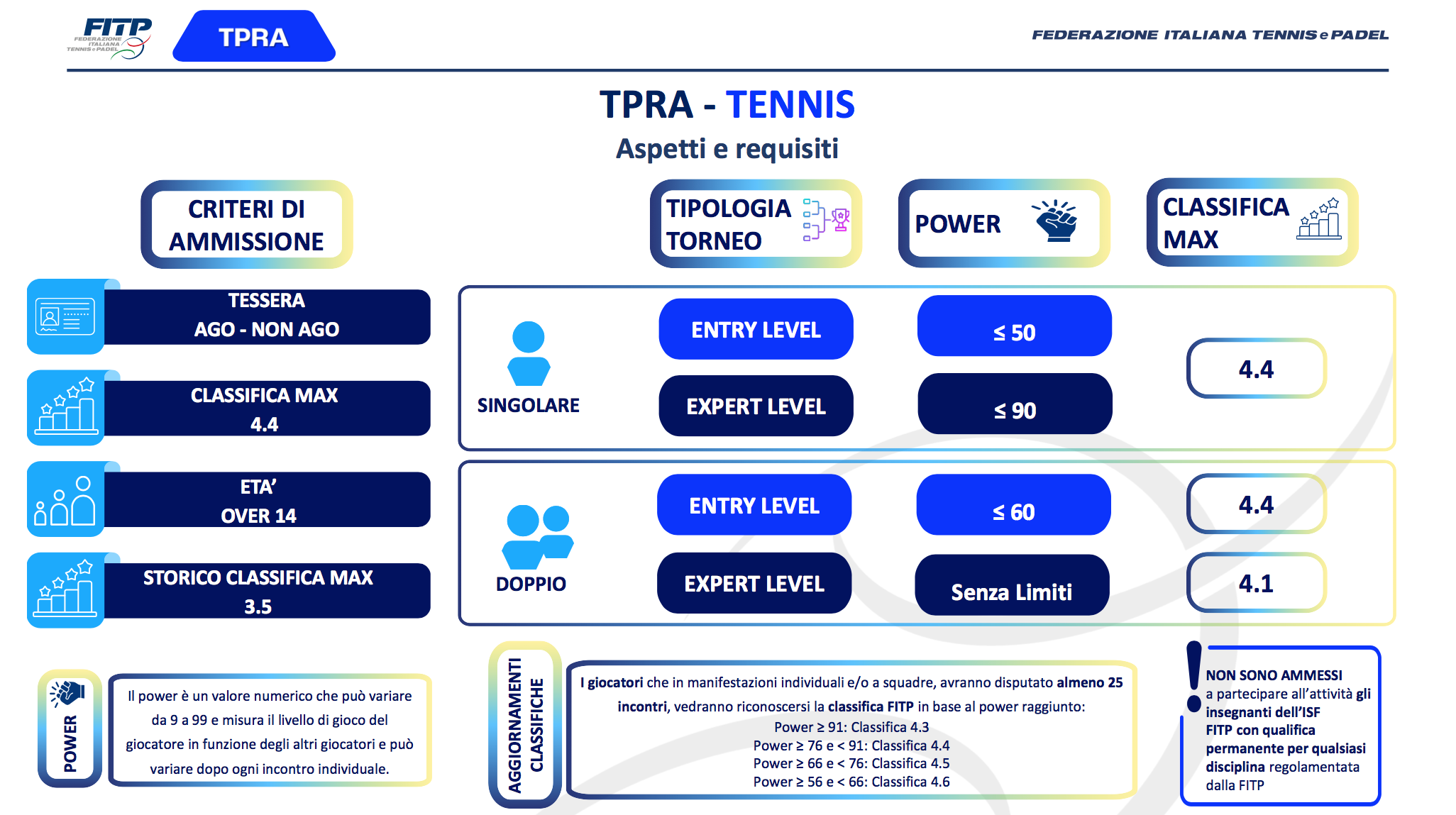 “Dal mondo del Tpra – spiega ancora Dell'Edera – arriva inoltre il concetto di 'power', il coefficiente che determina il livello di gioco per entrare nel mondo del circuito amatoriale, uno dei settori dell'attività di base, con tornei in calendario il sabato e domenica. In programma diverse competizioni: attività individuali, tornei di doppio maschili, femminili, misti o liberi, e anche Campionati a squadre. Una peculiarità è che prendiamo come riferimento finale le manifestazioni più importanti in Italia per quella determinata disciplina: parliamo dunque di un Road to Roma, di un Road to Torino, della Coppa delle Regioni che ha nella fase finale l'appuntamento di Bologna, poiché per formula di gioco ricorda la Coppa Davis. Nel padel, invece, il riferimento è il Major di Roma”. Ogni disciplina avrà poi le sue fasi regionali e nazionali che si chiuderanno con i Master.