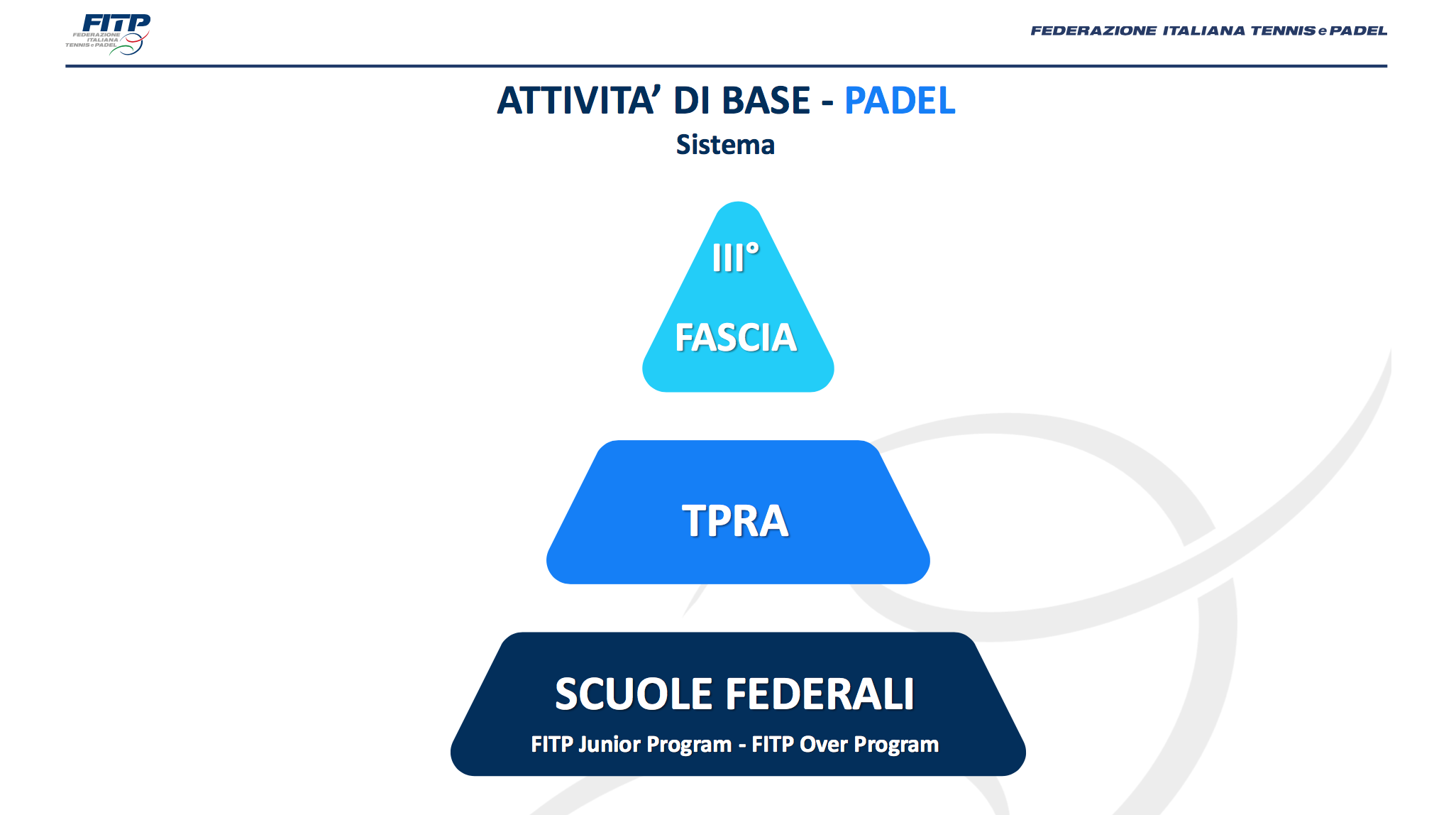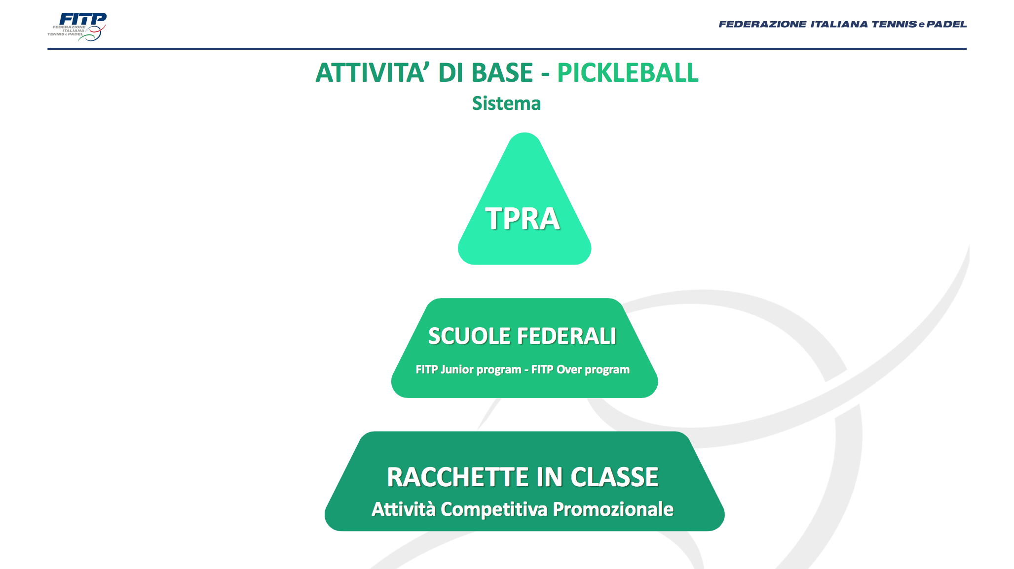 In tutto questo, assumono un ruolo fondamentale i programmi per i vari sport di racchetta. “Abbiamo redatto il programma – prosegue il direttore dell'ISF – per tutto ciò che riguarda l'attività amatoriale sia Junior che Over, che prevede per ogni disciplina una piramide che parte dalle scuole federali della FITP. In seguito si passa alle prove del circuito TPRA, per poi arrivare nel tennis alle categorie superiori per ogni disciplina di racchetta. Parliamo dell'attività per gli amatori dunque, ma fin dal principio ci siamo inventati un sistema di gare con regole semplici e mezzi semplificati, per consentire di fare partita solo dopo poche lezioni, 5-6 al massimo. Significa che si può cominciare il proprio percorso competitivo nel giro di un mese dopo aver preso una racchetta in mano per la prima volta”.
