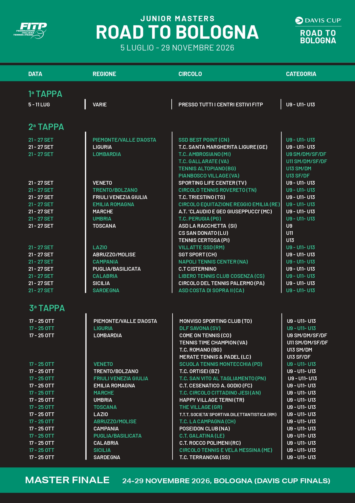 Si parte il 5 luglio all'interno dei Centri Estivi federali per concludersi dal 24 al 29 novembre 2026 nella città dei portici durante le Davis Cup Finals. Torna il prestigioso circuito giovanile organizzato dalla Fitp dedicato ai giocatori under 9, 11 e 13