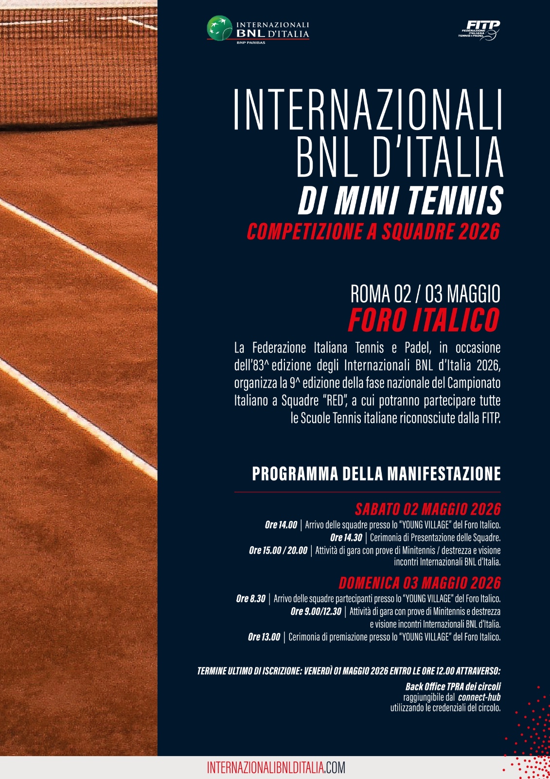 Ad accompagnare i raduni anche la terza edizione degli Internazionali BNL d’Italia di minitennis, un campionato a squadre dedicato alle scuole tennis federali, tappa speciale del circuito FITP Junior Program (categoria Red).