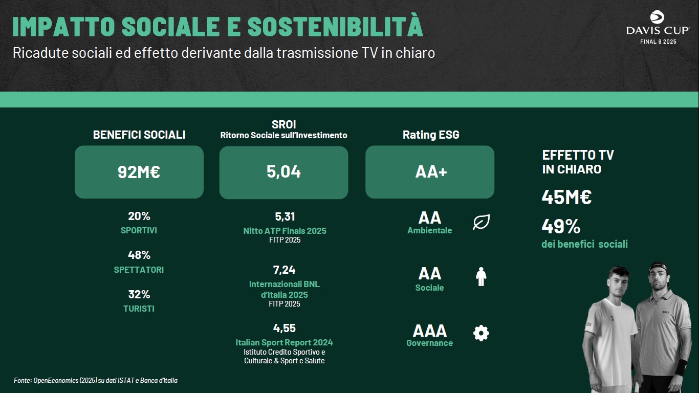 "I dati di Open Economics misurano l'impatto sociale, diviso in tre settori. C'è l'impatto sportivo, perché vedere partite come l'eroica Cobolli-Bergs stimola l'emulazione e spinge a iniziare a praticare il tennis, o a farlo di più; c'è l'impatto sugli spettatori, perché crea in chi assiste agli incontri, un benessere diffuso derivante dalla soddisfazione di aver visto grandi prestazioni: per gli italiani questo è moltiplicato dal vedere che nella propria città, nel proprio territorio, si possono realizzare spettacoli di così alta rilevanza. Infine, c'è quello per i turisti che hanno un beneficio e con più probabilità torneranno a Bologna nel prossimo futuro" ha sottolineato.