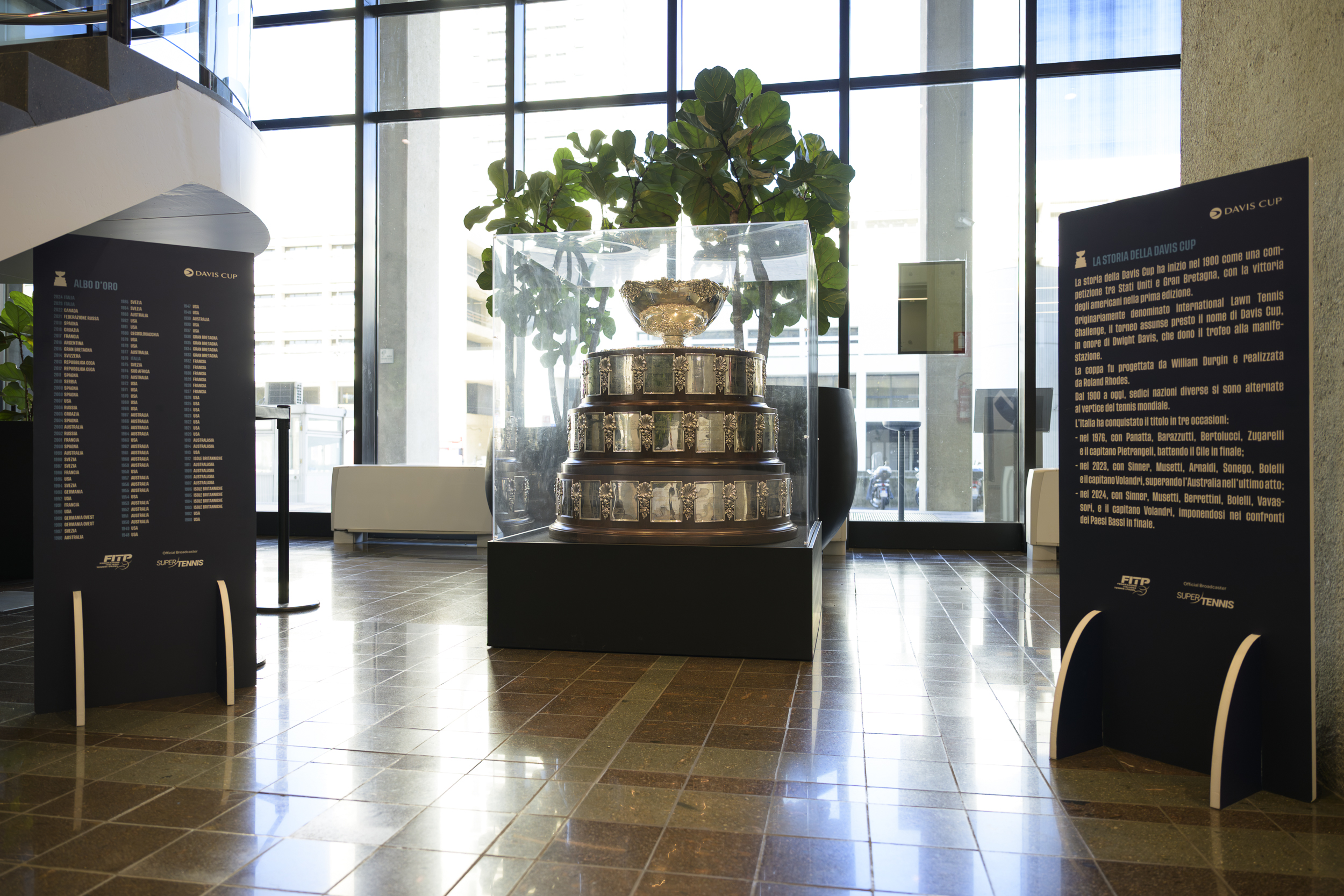 Il trofeo della Coppa Davis esposto in occasione della conferenza stampa di presentazione della Final 8 2025 a Bologna (Foto Cristina Gaddi)