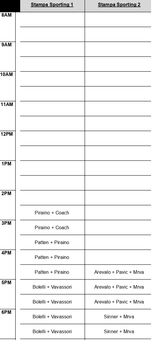 Gli orari degli allenamenti del 5 novembre al Circolo della Stampa-Sporting. Oggi anche Bolelli e Vavassori