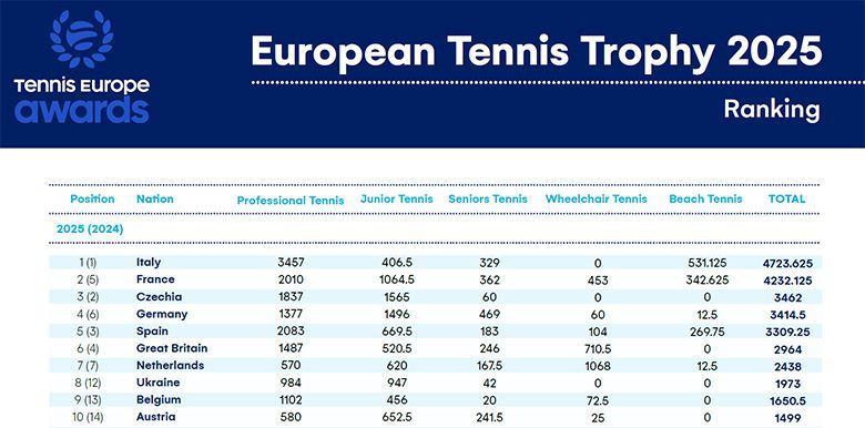 L'Italia è stata la grande vincitrice della cerimonia di premiazione annuale di Tennis Europe. Per il quarto anno consecutivo, l'Italia ha vinto lo European Tennis Trophy come nazione che ha ottenuto i risultati migliori tra le 48 che fanno parte dell'organizzazione. La classifica del premio si basa su un meccanismo che, per ciascun anno, assegna alle varie nazioni che fanno parte di Tennis Europe un punteggio per le prestazioni in cinque categorie (sport professionistico, attività junior, attività senior, wheelchair tennis, beach tennis). Non tutte le categorie pesano nello stesso modo, esattamente come non tutti i tornei assegnano gli stessi punti validi per la classifica ai giocatori.