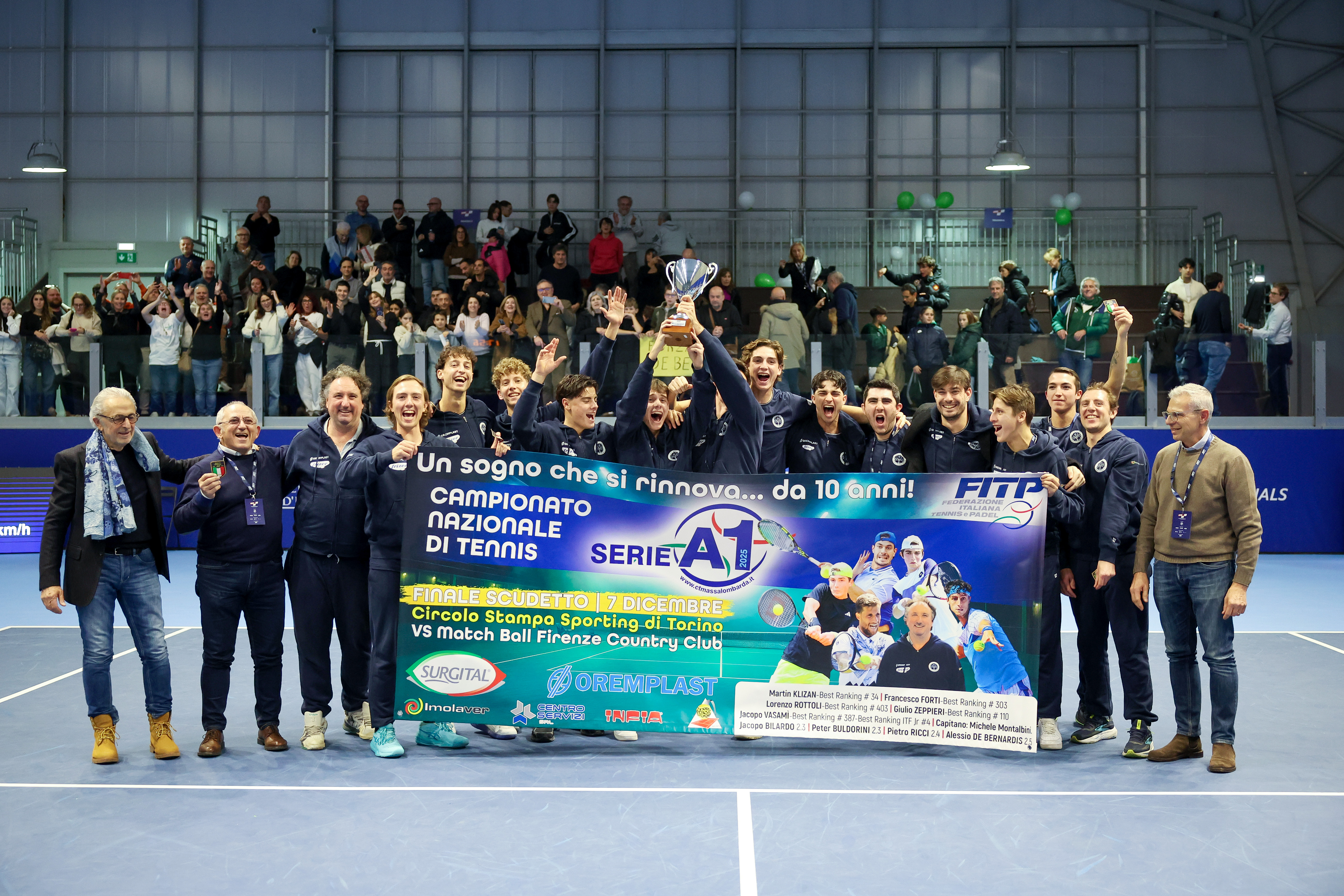 Sono servite 7 ore e mezza di tennis, fino al doppio del definitivo 4 a 1 conquistato da Lorenzo Rottoli e Jacopo Bilardo. Sono i loro, elementi del vivaio del club, i volti del trionfo che riporta il tricolore in Emilia-Romagna, 14 anni dopo il successo dei parmensi del Circolo del Castellazzo. Un’enorme gioia, condivisa con un centinaio di tifosi e col presidente del club Giorgio Errani (padre di Sara), arrivati a Torino a sostenere un gruppo di ragazzi dall’età media piuttosto bassa (23 anni e mezzo quella del quartetto impiegato per la finale), guidati dalla panchina dal capitano Michele Montalbini. Nel team Campione d’Italia, oltre ai già citati Rottoli e Bilardo, anche Giulio Zeppieri, Francesco Forti, Jacopo Vasamì, Peter Buldorini, Pietro Ricci, Alessio De Bernardis e lo slovacco Martin Klizan, assente a Torino ma impiegato nella fase a gironi.