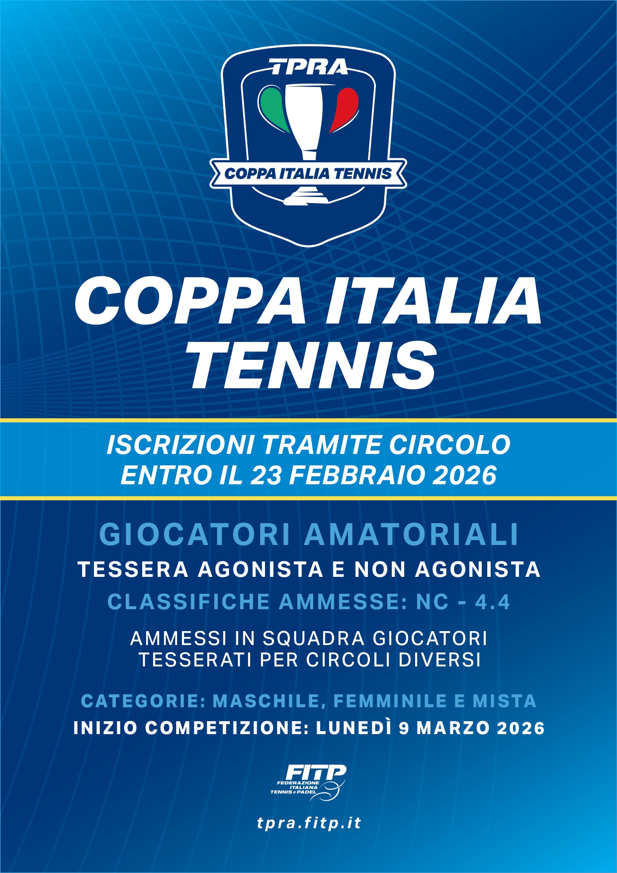 Dopo il grande successo dell’edizione 2025, che ha portato in campo quasi 1.500 squadre e oltre 11.000 appassionati in tutta Italia, torna la Coppa Italia Tennis TPRA 2026. Il format, già apprezzatissimo lo scorso anno, viene confermato e arricchito con una novità importante: l’introduzione della categoria Bronze anche nei tabelloni provinciali e regionali, così da rendere la competizione ancora più inclusiva e coinvolgente per tutti.