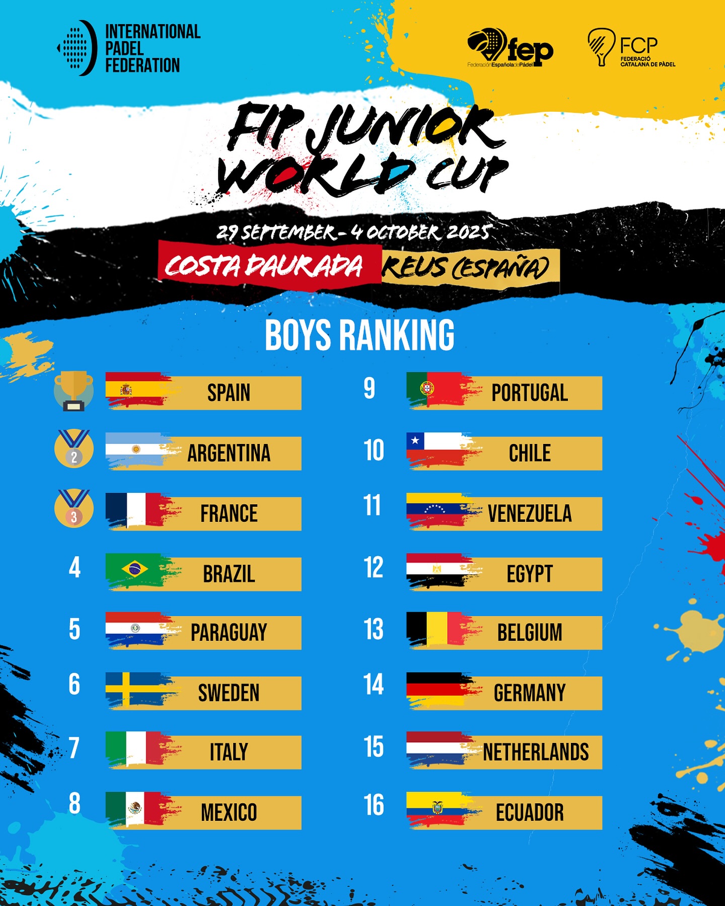 Alla Spagna tutti i titoli mondiali: sia i due per nazioni (quello maschile contro l’Argentina, quello femminile contro il Portogallo), sia i sei in palio negli Open a coppie, peraltro in finali quasi interamente in famiglia. Unica eccezione quella degli under 18: si sono “intromessi” i paraguaiani Dehnike/Gonzalez, ma hanno vinto comunque i favoriti Castano/Rivas. Due quarti posti per le coppie italiane al maschile: sconfitta nella finale per il bronzo sia per gli under 16 Di Martino/Laurino sia per gli under 18 Sargolini/Giovannini, entrambi superati da coppie francesi.