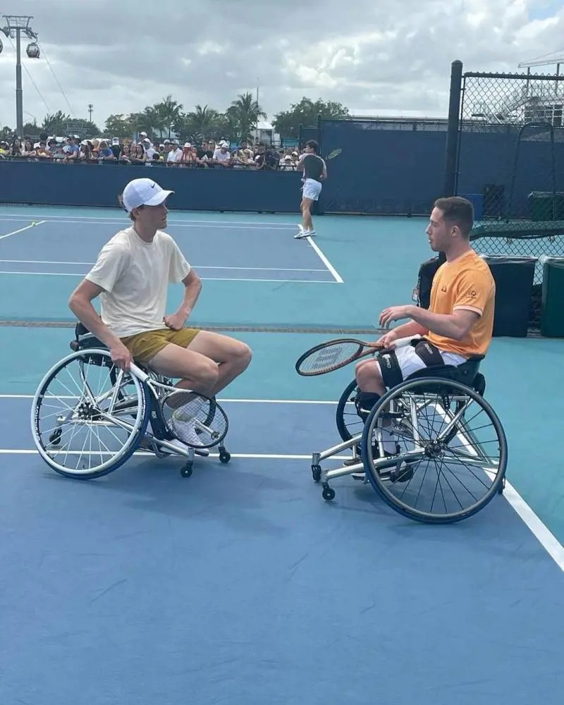 Jannik Sinner a confronto con Alfie Hewett, una leggenda del wheelchair tennis, all'Hard Rock Stadium in occasione del Masters 1000 di Miami