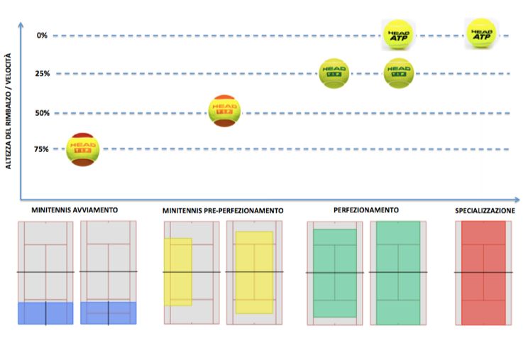 Cinque tipi di palle – Nel Minitennis vengono utilizzate varie tipologie di pallina caratterizzate dai colori rosso, arancio, verde e giallo.