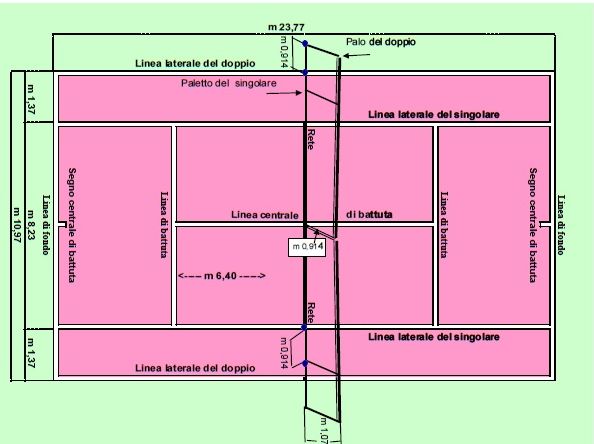 Il campo da tennis ha una forma rettangolare, è lungo 23,77 m e largo 8,23 m per il singolo e 10,97 m per il doppio. È diviso a metà da una rete tesa tra due pali che ha un’altezza al centro di 0,914 m e ai lati di 1,07 m. Negli incontri di singolare vengono utilizzati dei paletti, posizionati nei corridoi.