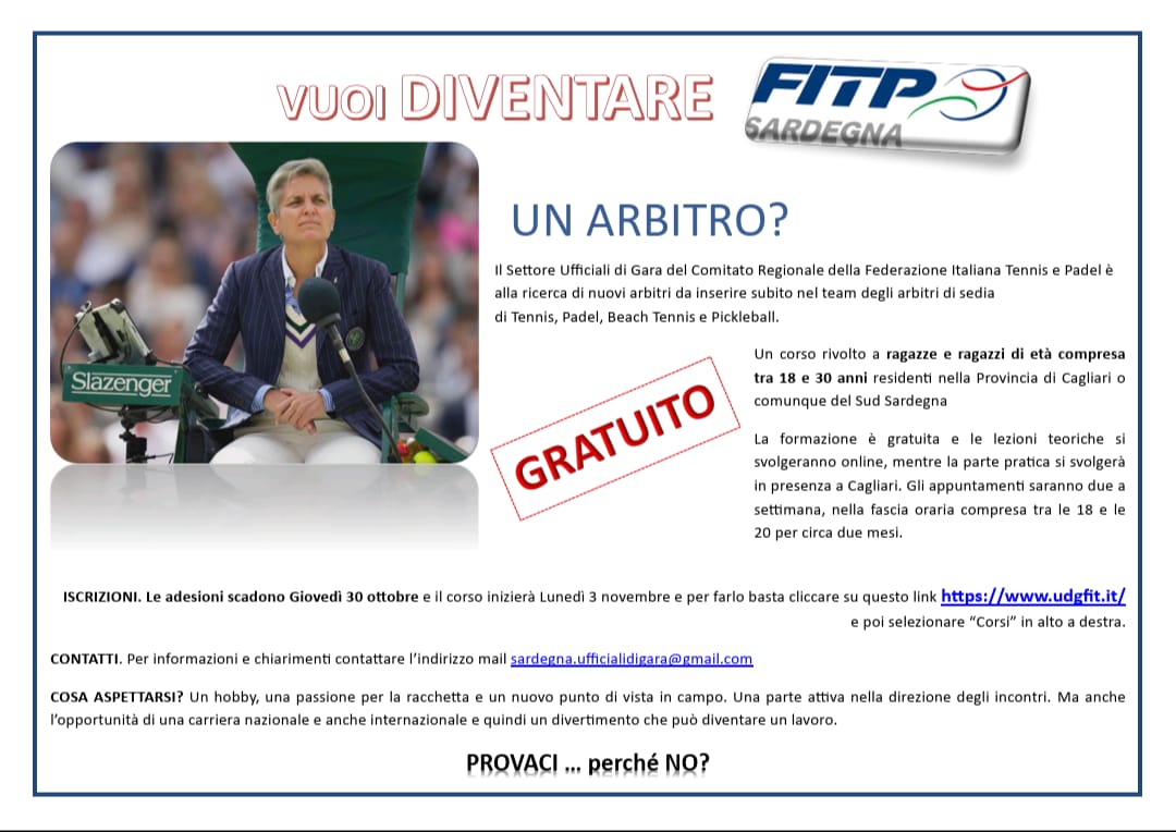 Una domanda, una sfida: un'opportunità per tanti appassionati, giocatori amatoriali o che non hanno mai impugnato una racchetta: "Vuoi diventare un arbitro?" Comincia così il nuovo progetto del settore Ufficiali di gara della Sardegna, offrendo una possibilità, gratuita, di coltivare un hobby ma che può perfino diventare una carriera e dunque un lavoro, come successo a tanti arbitri italiani e sardi. Che dall'Isola sono arrivati ad arbitrare "sul seggiolone" di grandi tornei Atp e Wta.